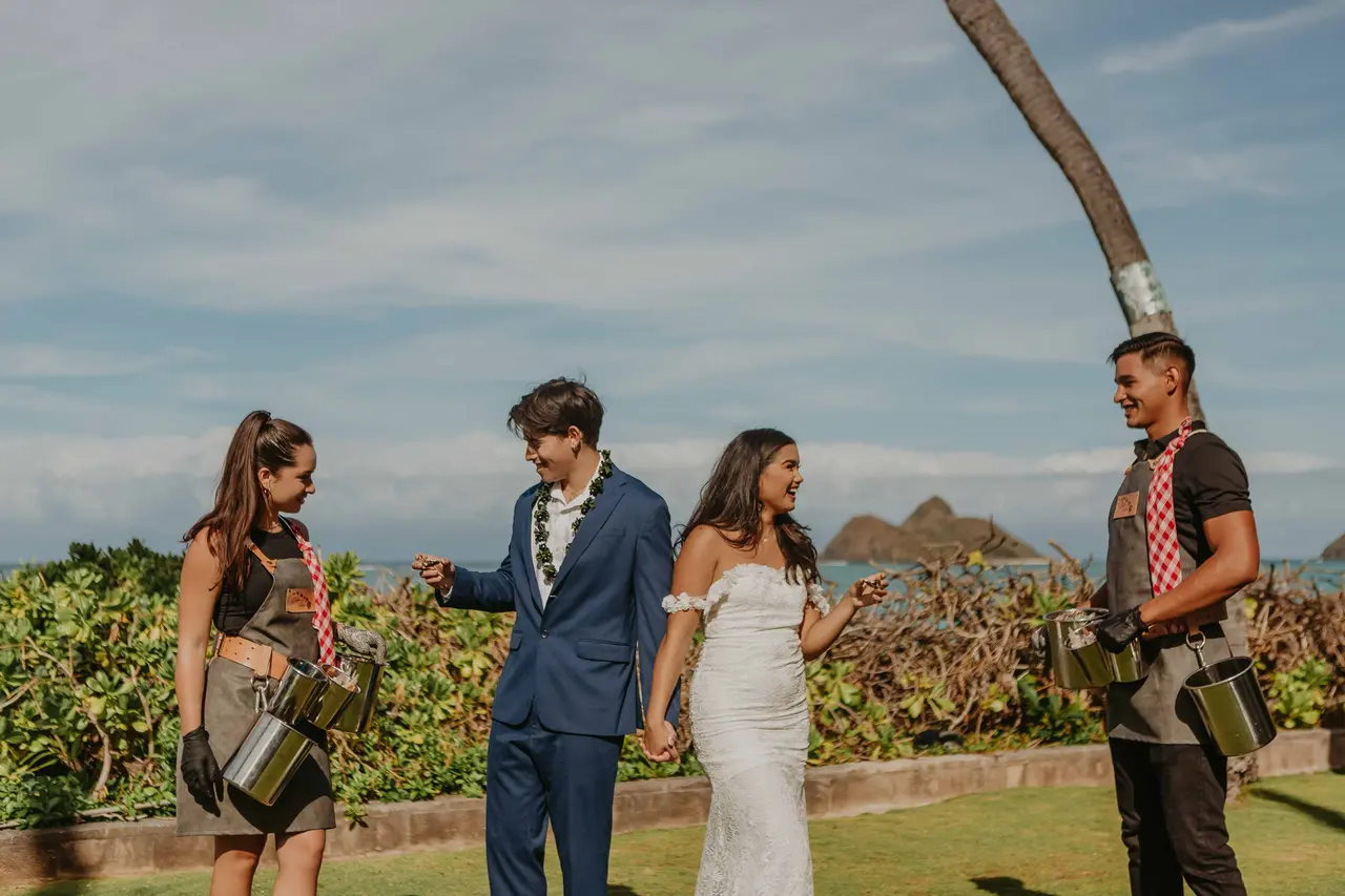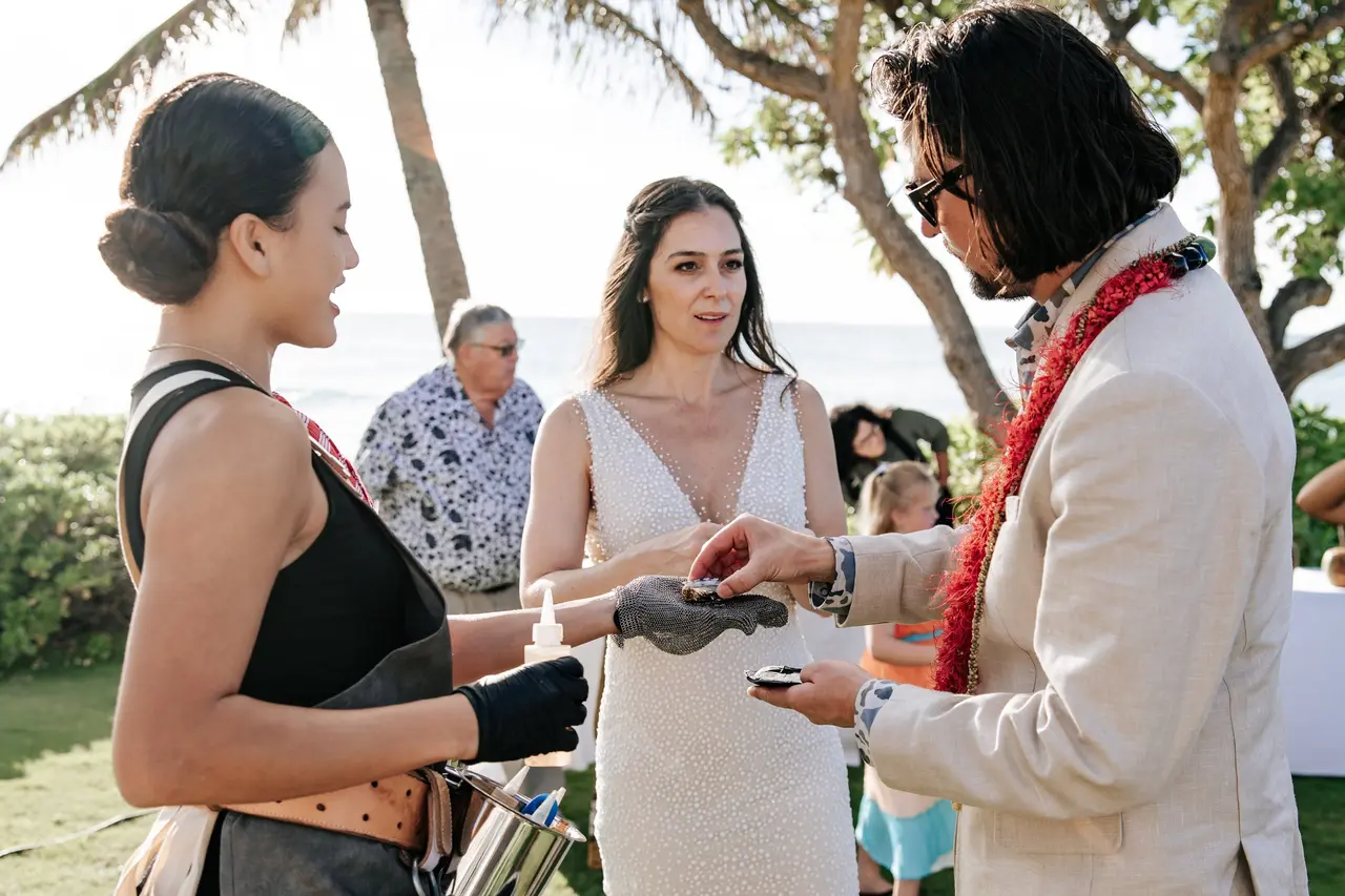 Oysters Hawaii elevates wedding catering with a luxury oyster and caviar experience like no other. Based in Kailua, this certified woman-owned mobile catering service brings the first-ever oyster shucking and caviar bar to Hawaii weddings. From unlimited oysters served with premium sauces to locally inspired condiments and full event setup and cleanup, they deliver an unforgettable culinary experience that blends elegance with the spirit of Aloha.